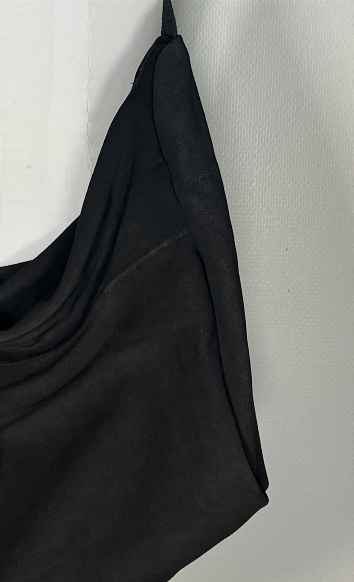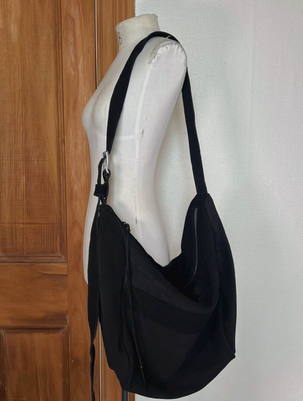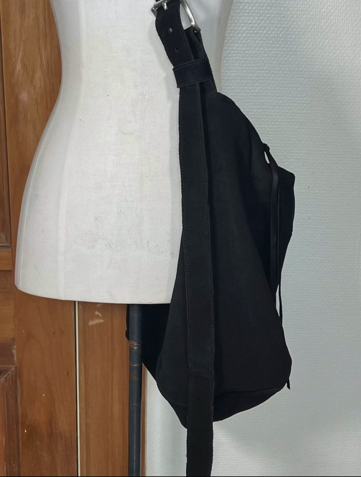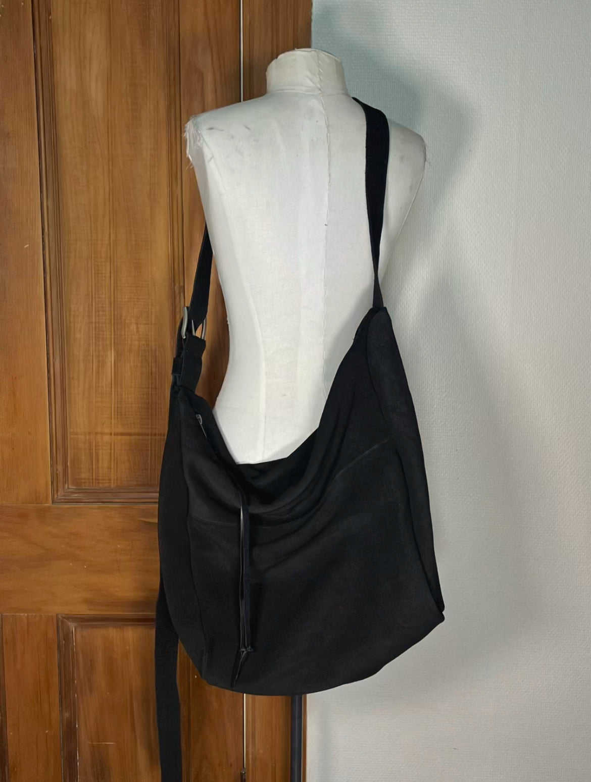 This large sized bag adjusts with a sterling silver buckle. Featuring a thick matte zipper with attached cowhide leather tassels. Lining inside is composed of a 100% Italian Herringbone linen, with a pocket perfect for any smaller items. The outer a sturdy and heavy moccasin suede, structured in nature but will gradually form to the wearer.
