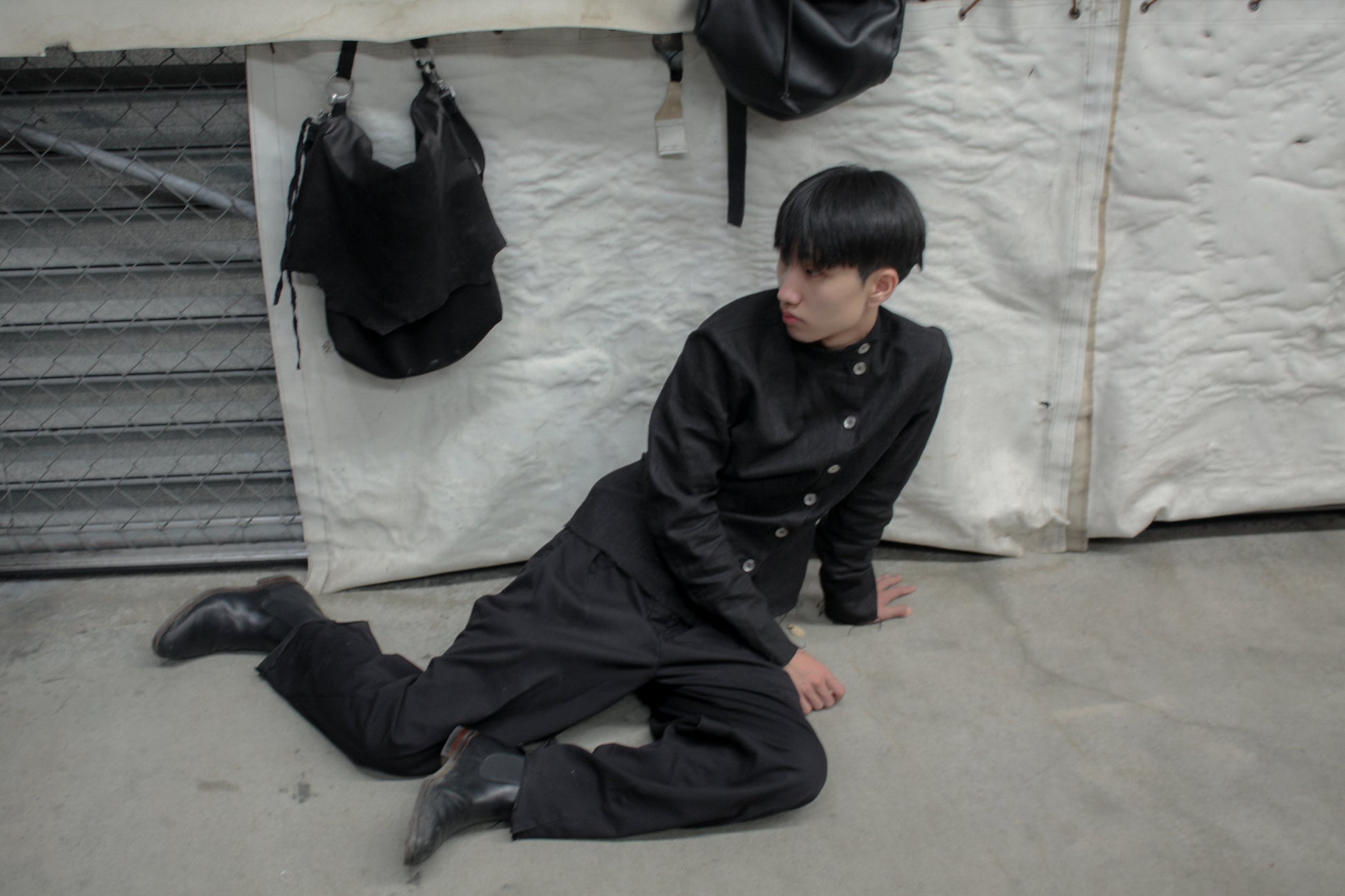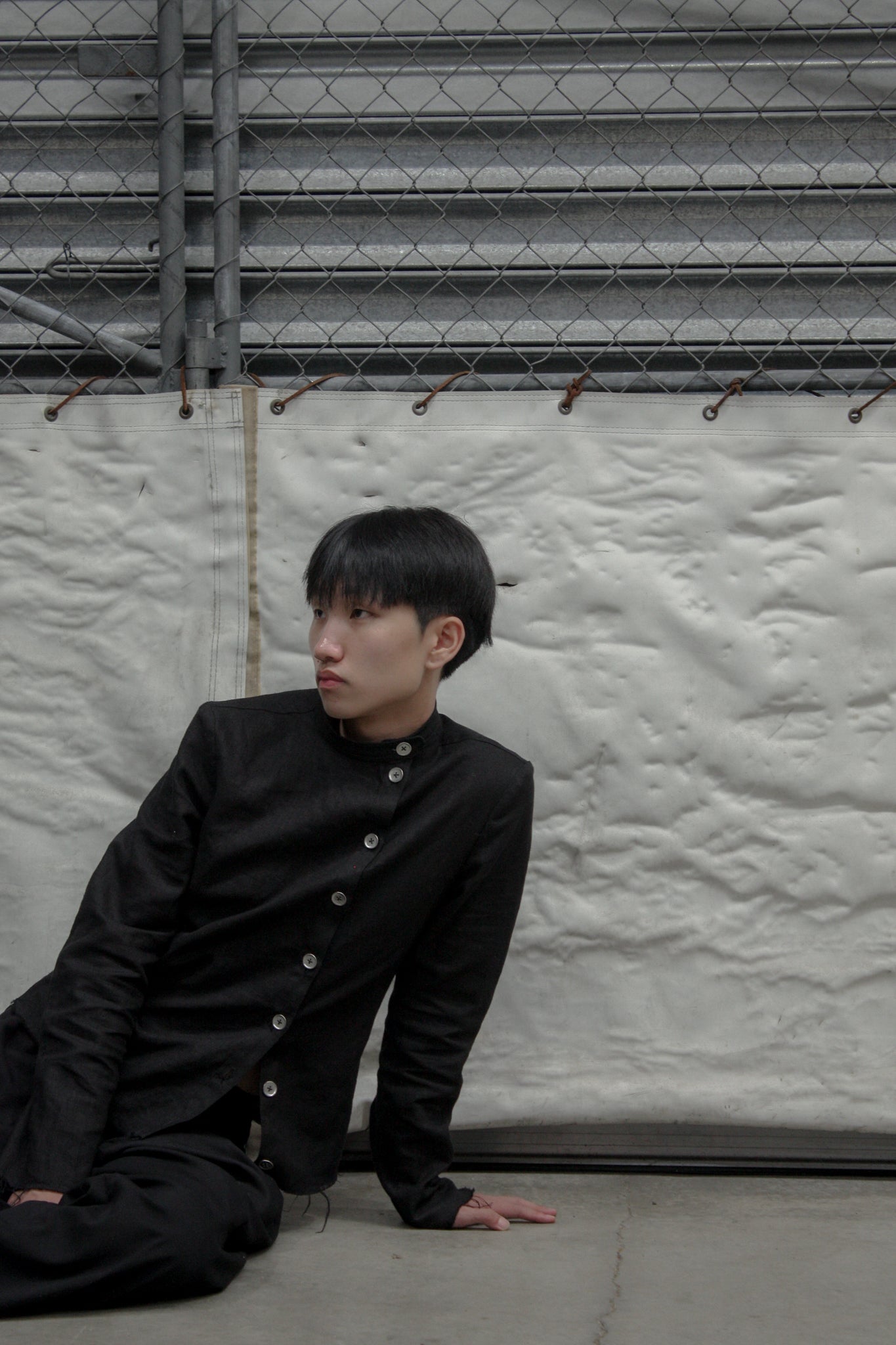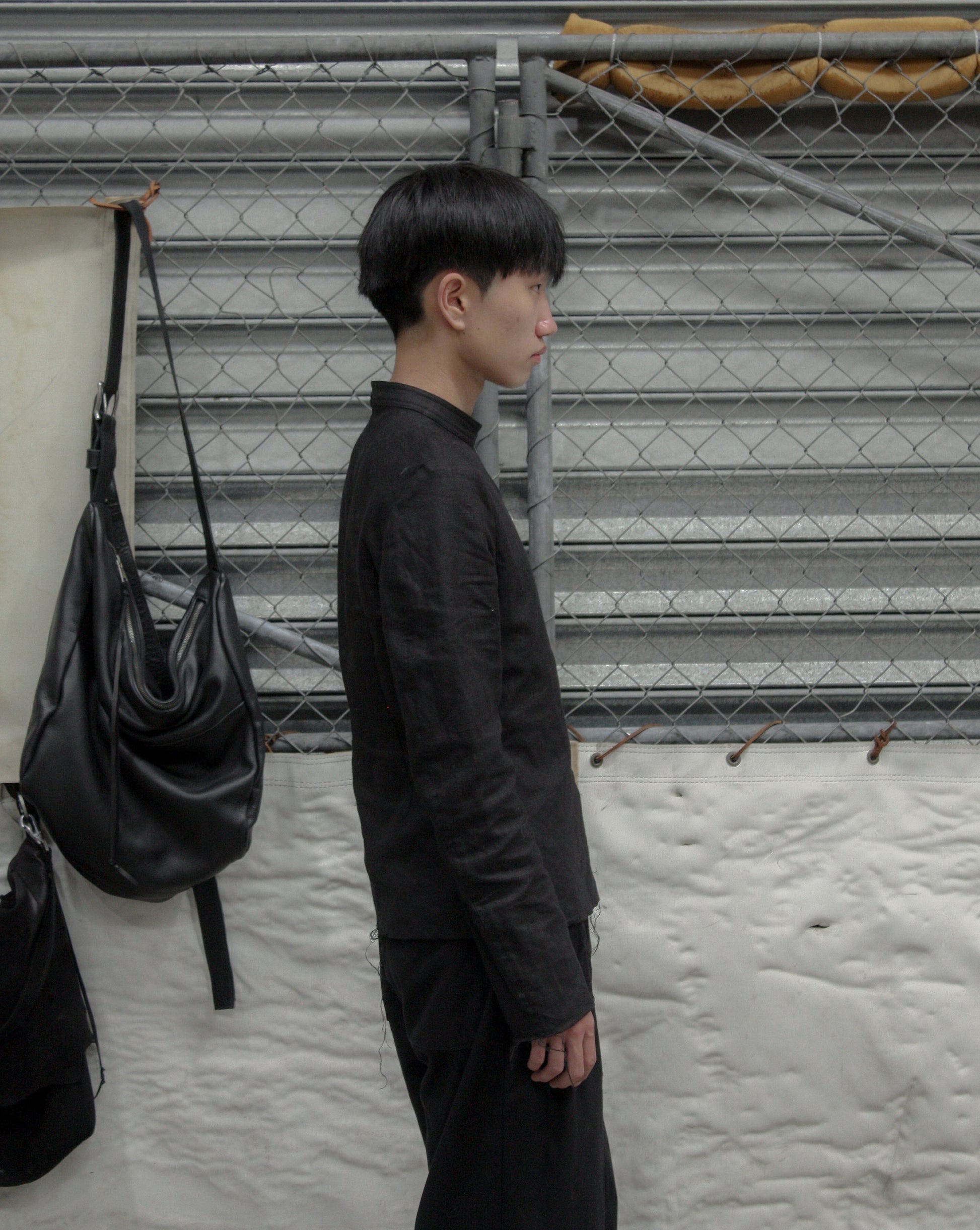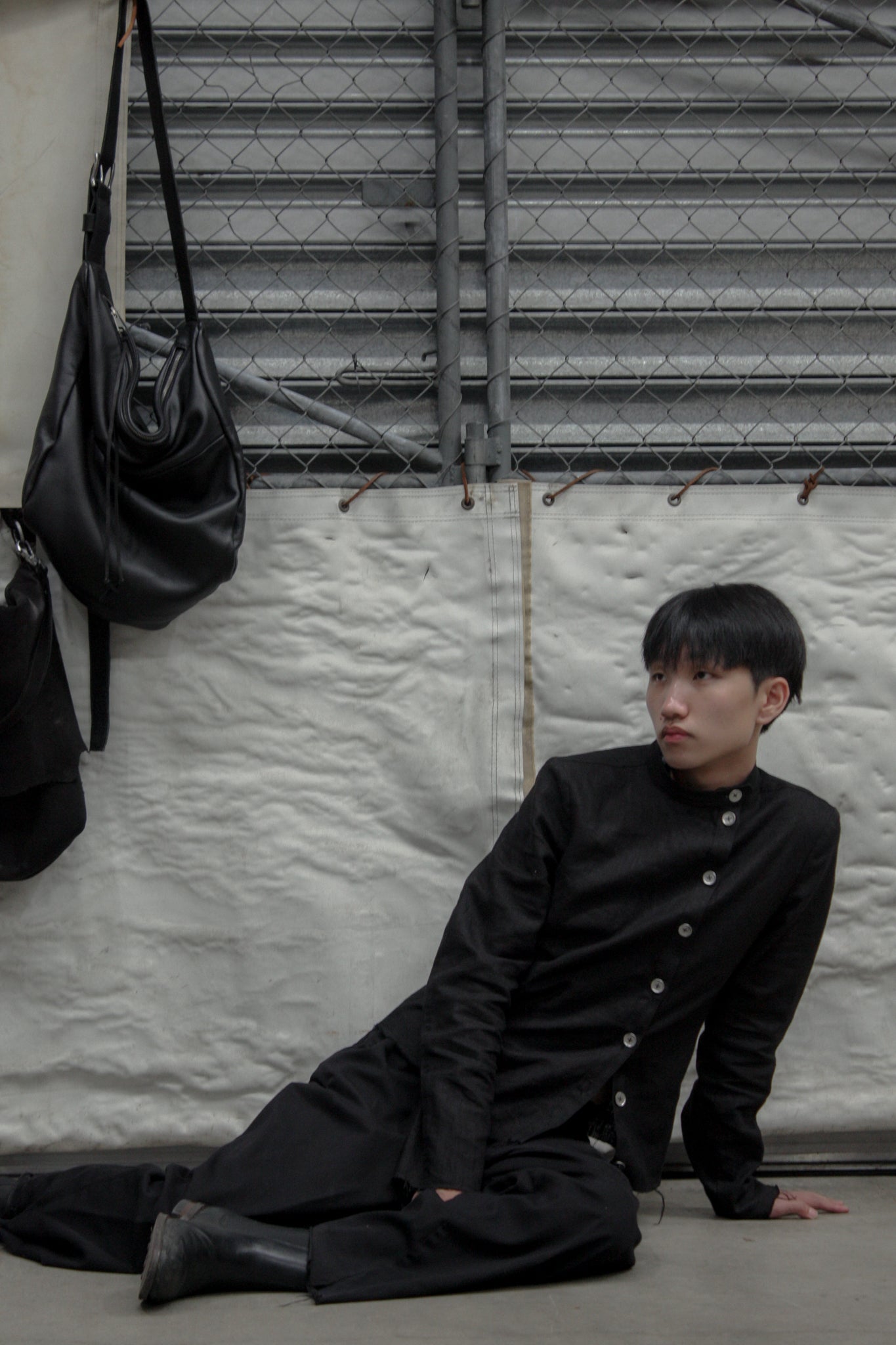 The Yvette shirt is a long sleeve tailored shirt with a mandarin collar, and an asymmetric button placket easing into the left side. Adorned with matted silver buttons for the closure, all seams excluding the underarm are constructed using French seams. With hems being left raw, but stabilised with a hand sewn running stitch to maintain longevity.